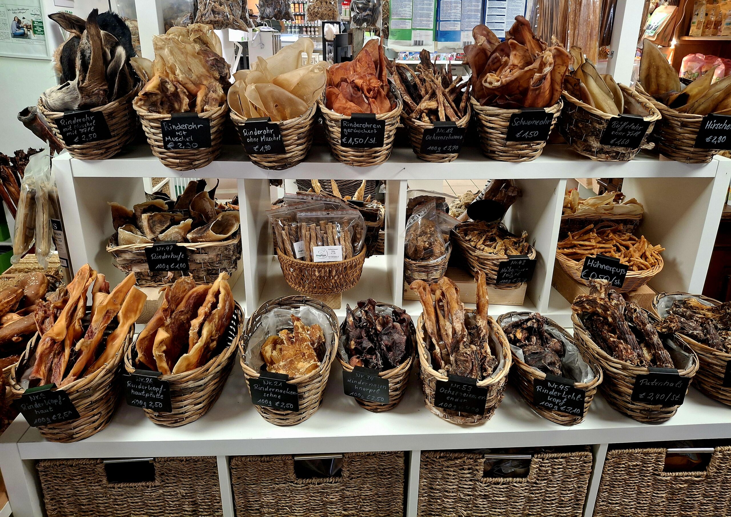 Knochen, Kaustangen, Platten, Ohren mit und ohne Fell, Kopfhaut und Platten – eine Reihe an Kauartikeln steht zur Auswahl.