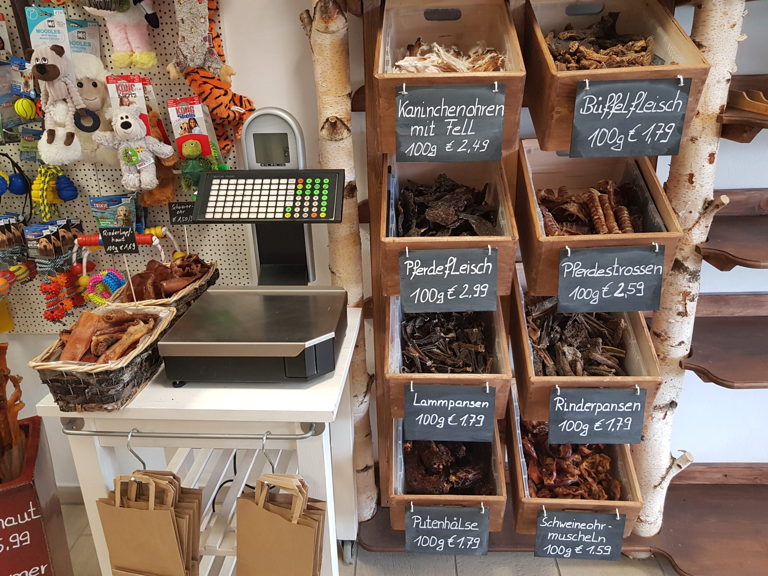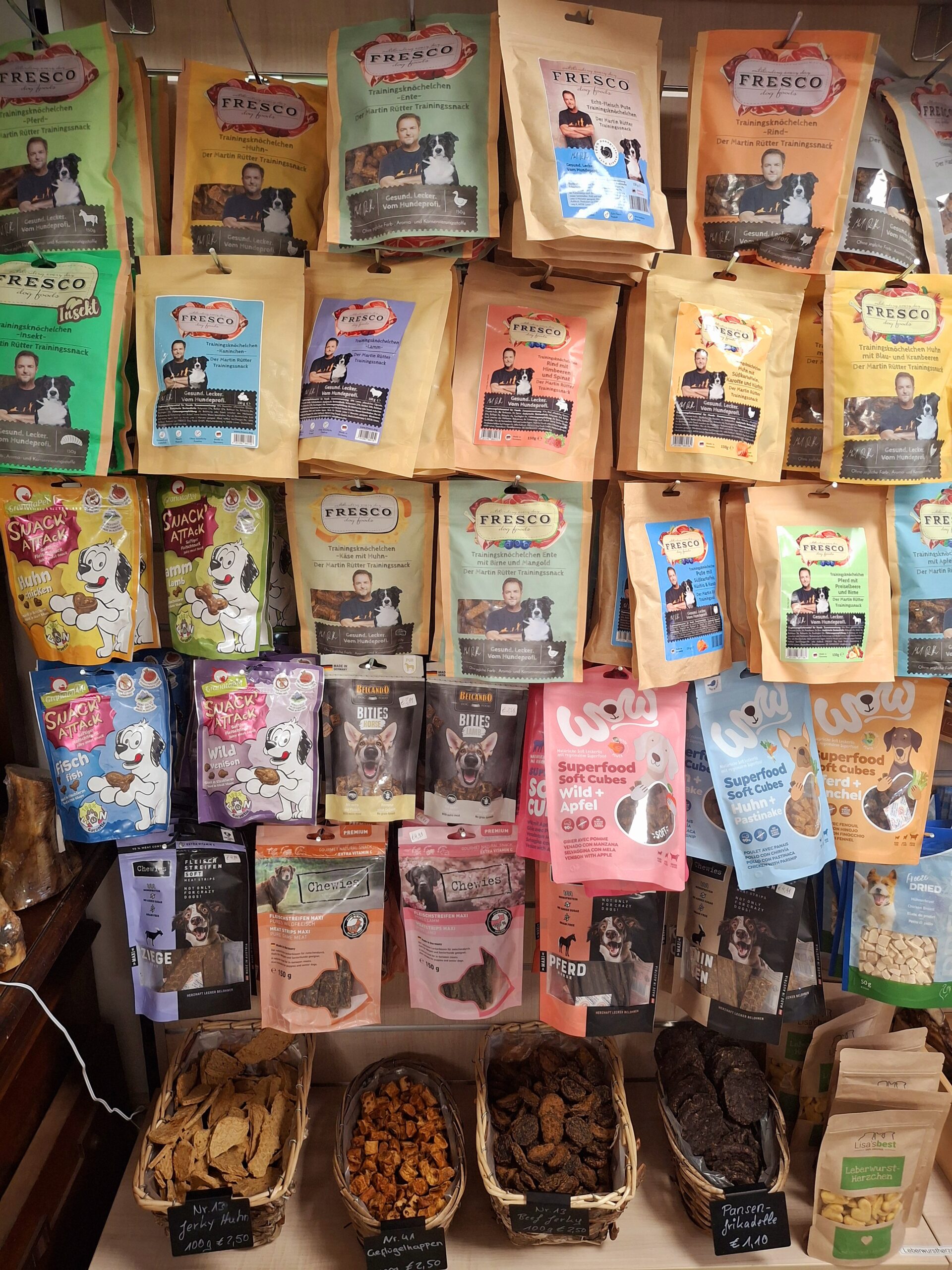 An unserer offenen Leckerlibar steht eine grosse Auswahl an kleineren und mittleren Leckerlis zur Verfügung. So kannst Du die Menge und Grösse selbst bestimmten.